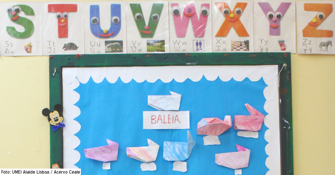 Evangely Maria Oliveira, coordenadora da UMEI Alaíde Lisboa, na UFMG, conta como a linguagem escrita é trabalhada ali, corroborando a ideia de partir de algo em que a letra tem vida: “O primeiro contato que o aluno da Educação Infantil tem com as letras é a partir de seu nome, que é o elemento principal que vai desencadear o reconhecimento das letras, porque a partir daí começam a surgir comparações entre os nomes deles com nomes dos colegas, das professoras, das histórias que são contadas para eles, e assim por diante”.