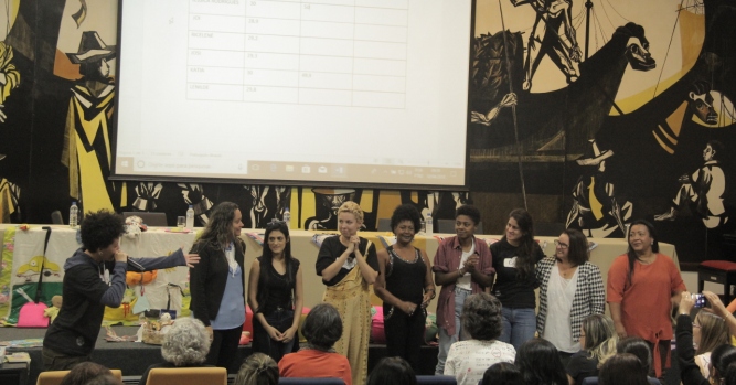 Depois da apresentação artística, as professoras Andrea Pinheiro Tomaz de Carvalho (UMEI Jardim Laguna, Contagem), Rosângela Mirian Silva, Juliene de Lizandra Gonçalves, Jean Santos Andrade, Eldine Oliveira Silva (UMEI Paulo VI, Belo Horizonte) e Mônica Correia Baptista (UFMG) foram chamadas para compor a mesa de debate que viria a seguir.