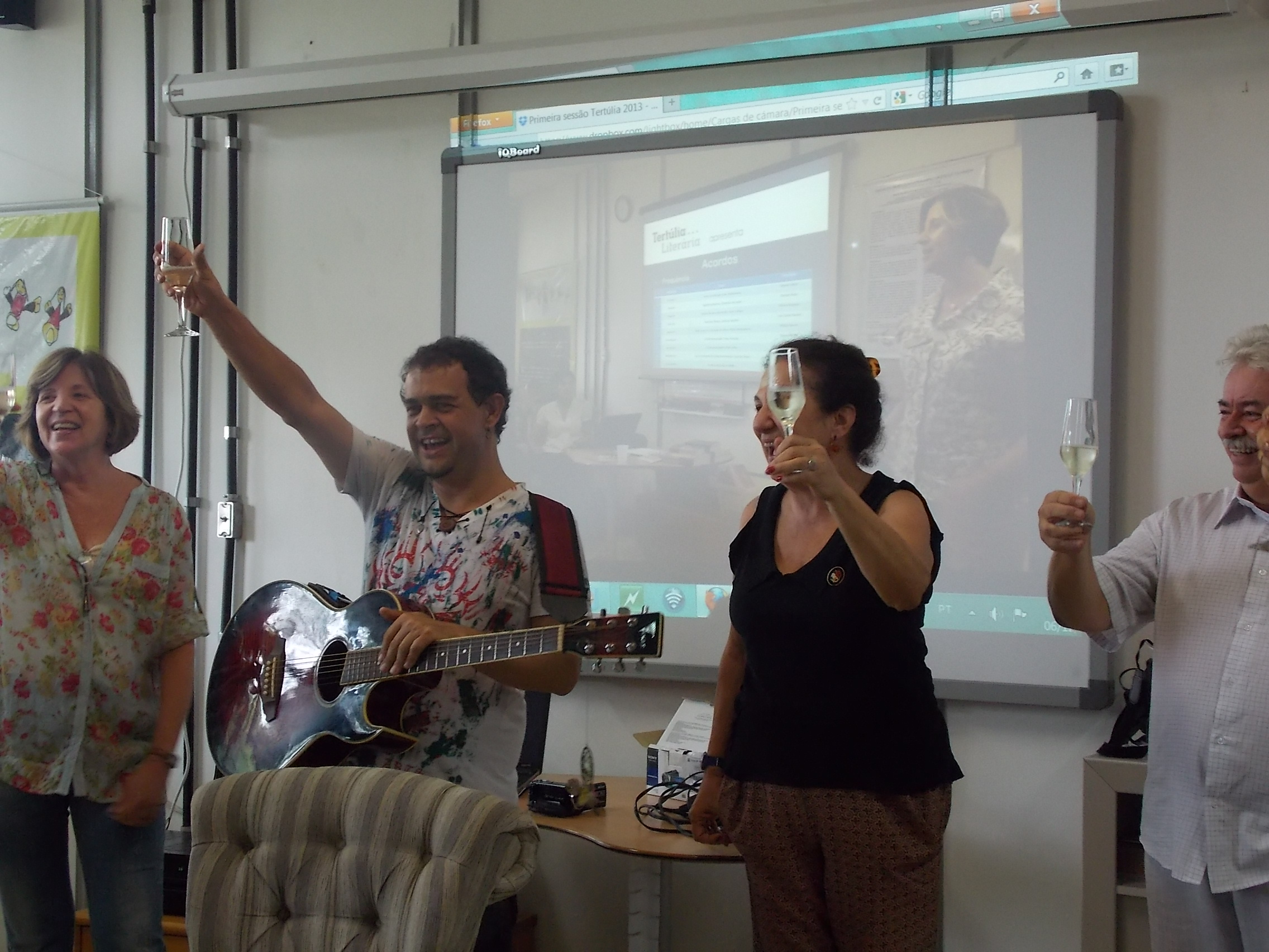Na dia 6 de dezembro, a equipe do Projeto Tertúlia Literária e seus diversos participantes se reuniram na sala de leitura da Biblioteca da FaE. Dessa vez, o encontro não foi para discutir as experiências literárias do mês, mas para comemorar o encerramento da edição de 2013 e o aniversário de cinco anos do projeto. A tarde foi marcada por muita animação, com direito a música ao vivo, brinde com champanhe, comidinhas e depoimentos dos participantes. Como o tema da edição deste ano era “fofoca”, nada mais apropriado para o encerramento do que uma festança.