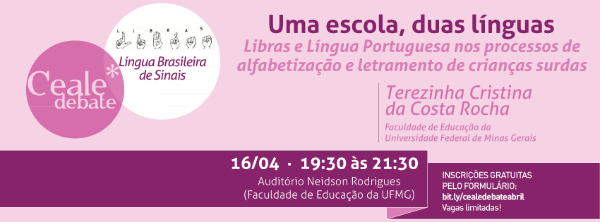 Para refletir sobre o processo de aquisição da linguagem por crianças surdas nos primeiros anos de vida e em sua inserção na educação básica, o Ceale Debate convida no mês de abril a professora Terezinha Cristina da Costa Rocha, que discutirá o tema "Uma Escola, Duas Línguas: Libras e Língua Portuguesa nos processos de alfabetização e letramento de crianças surdas". A palestra ocorre no próximo dia 16 (quinta-feira), das 19h30 às 21h30, no Auditório Neidson Rodrigues da Faculdade de Educação da UFMG (Campus Pampulha). As vagas são limitadas e a inscrição, gratuita, deve ser feita pelo preenchimento do formulário disponível em: bit.ly/cealedebateabril