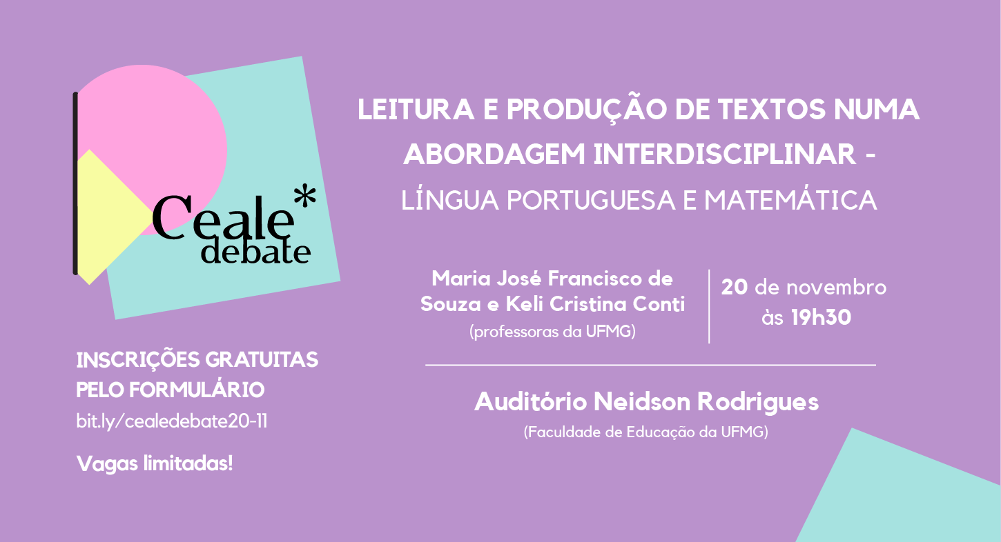 Estão abertas as inscrições para o Ceale Debate de novembro, que abordará o tema "Leitura e produção de textos numa abordagem interdisciplinar - Língua Portuguesa e Matemática." As convidadas são as professoras da Faculdade de Educação da UFMG Maria José Francisco de Souza e Keli Cristina Conti. O evento ocorre no dia 20 de novembro (terça-feira), das 19h30 às 21h30, no Auditório Neidson Rodrigues da Faculdade de Educação da UFMG, no campus Pampulha (Avenida Antônio Carlos, 6.627).