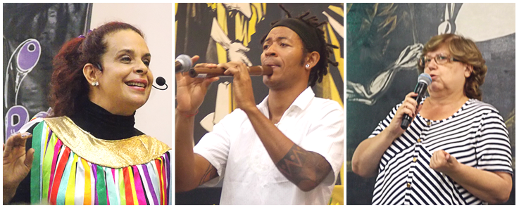 Integrantes do grupo Maria Farinha (esquerda e centro) e a palestrante Eliane Gazire (direita) na abertura do Seminário Final do Pnaic