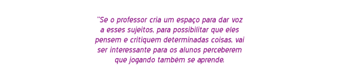 O que pode ser feito é criar espaços de formação. Em nosso grupo de pesquisa, oferecemos dois cursos de extensão ao ano. Criamos cursos de formação em que, além de ter uma reflexão teórica sobre essa interação, os professores também jogam. Só jogando o professor vai perceber se dá ou não para usar determinado jogo. O professor também pode ter um pouco mais de informação sobre o jogo que, de repente, os alunos queiram discutir, de diferentes maneiras: a partir de vídeos de jogabilidade no YouTube; em várias comunidades que falam sobre jogos; em sites especializados; e ainda consultando o site de classificação indicativa do Ministério da Justiça. Assim, o professor tem várias fontes de informação sobre os jogos que estão no imaginário da criança.