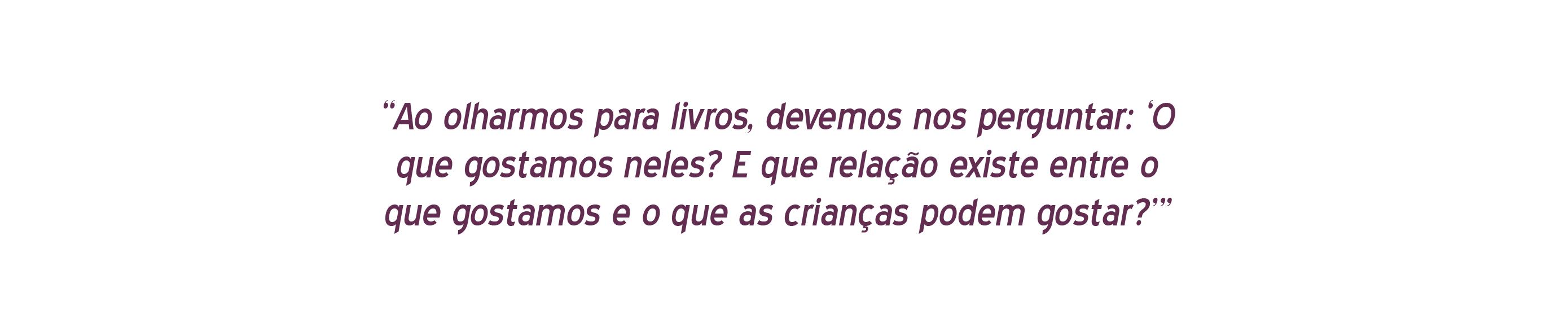 Acho que estamos conversando sobre dois sistemas diferentes: em um momento estamos selecionando livros para o sistema escolar, então precisamos usar nossos critérios para isso. Já, por outro lado, se esse conto de fadas vendeu milhões, isso não é problema nosso. Estamos cuidando de um certo tipo de livro. Minha ideia fundamental, depois de muitos anos lutando nesse campo, é dizer que precisamos de ter uma atitude de respeito e, ao olharmos para livros, devemos nos perguntar: “O que gostamos neles? E que relação existe entre o que gostamos e o que as crianças podem gostar?” Por exemplo, se compararmos a complexidade da narração de um romance contemporâneo com outro escrito há cinquenta anos atrás, é possível notar a diferença da prosa. O que você quase certamente vai notar é que a prosa moderna é menos complexa em termos linguísticos. Por outro lado, pode ser mais rica na referência a outros elementos culturais.
