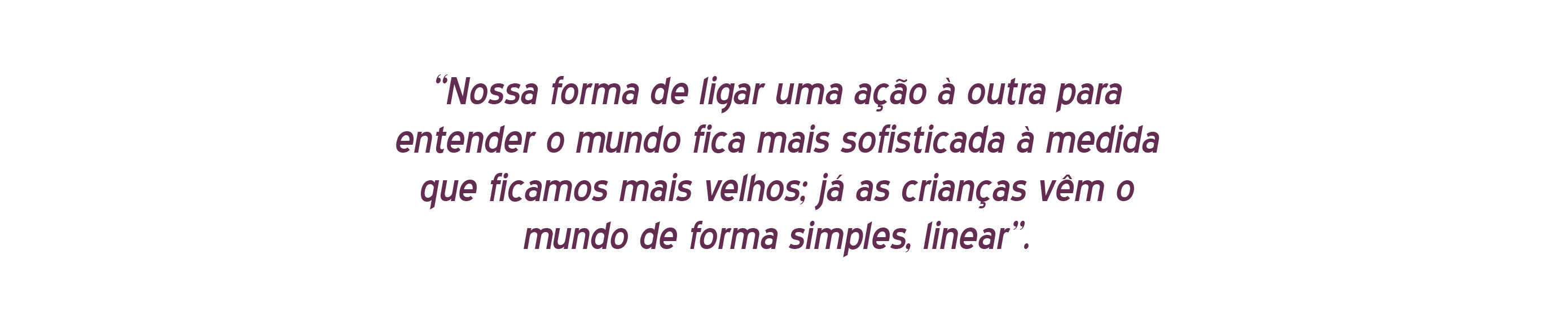 Na Inglaterra, os escritores de romances do século 18 escreviam longos fluxos de acontecimentos. Isso muda no século 19, quando a causalidade torna-se primordial. Assim, se alguém diz que “o rei morreu e em seguida a rainha morreu”, temos uma história; se alguém diz que “o rei morreu e em seguida a rainha morreu de tristeza”, temos um enredo. Há uma conexão motivacional, o que significa que um enredo complexo funciona de modo reflexivo, sempre volta a si. Acontece isso com os romances mais sofisticados, mas não é assim que começamos a contar histórias, porque elas vêm de nós mesmos, é uma sequência, tudo se relaciona a nós mesmos, como “eu andava na estrada e vi aquilo e em seguida aquilo, e depois aquilo outro... Então, quando me afastei um pouco, caminhei pela estrada e aquela coisa estava atrás de mim”. Nossa forma de ligar uma ação à outra para entender o mundo fica mais sofisticada à medida que ficamos mais velhos; já as crianças veem o mundo de forma simples, linear: “Isso acontece e depois isso acontece…” Enquanto o adulto sofisticado que aqui imaginamos estaria analisando essas coisas. “Por que isso acontece? Quais as implicações disso?”