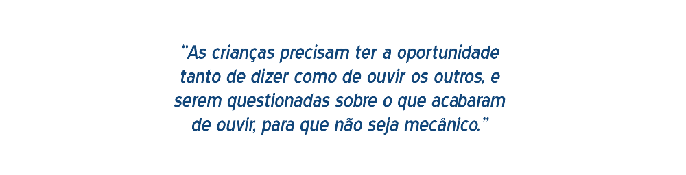 Como eu disse antes: conversa, conversa, conversa. Se você observar, em quase todas as escolas tem hora de conversa. Às vezes, ela se torna algo mecânico: a professora diz geralmente às segundas-feiras: “o que vocês fizeram no fim de semana?”. E as crianças já passam a responder mecanicamente e as professoras às vezes nem prestam atenção. As crianças precisam ter a oportunidade tanto de dizer como de ouvir os outros, e serem questionadas sobre o que acabaram de ouvir, para que não seja mecânico. Às vezes, a criança fala e ninguém pergunta: “Não entendi o que você quis dizer. Diga de novo? Vamos prestar atenção, gente”. Está entendendo? É envolver todos.