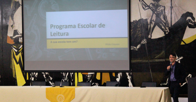 O professor Rildo Cosson iniciou sua fala questionando a plateia sobre a presença de um programa literário nas escolas. Ele reforçou a importância da leitura e o papel da escola nessa formação. Rildo apresentou quatro formas de leitura (o silêncio, a voz, a memória e a interação) e como elas podem ser feitas nas escolas. Rildo ressaltou a importância do “momento de leitura”, quando os professores separam pelo menos 15 minutos para a leitura silenciosa de um livro, dizendo que, para que o projeto seja efetivo, é preciso que toda a escola se envolva e participe. Portanto, o professor também deve fazer uma leitura no mesmo momento que os alunos, por exemplo. Ele disse que isso foi fator decisivo para o sucesso ou não da implementação do programa em escolas que já o desenvolveram.