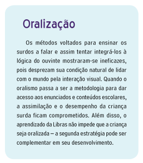 Como a maioria dos surdos são filhos de pais ouvintes (cerca de 90%), a introdução à Libras costuma ter início tardio e lento. Na maioria das vezes, os pais preferem, inicialmente, investir na tentativa de oralizar a criança (ver Oralização), encaram a condição como um problema de saúde e sequer conhecem a Língua Brasileira de Sinais. A orientadora pedagógica Eliane Cristina de Oliveira, da Escola Municipal Maria Aparecida dos Santos Ronconi, em São José dos Campos (SP), ressalta que esse desconhecimento atrasa o desenvolvimento dessa criança. “O surdo é igualmente capaz e inteligente, só que o caminho para ele aprender é diferente. É a Libras primeiro”, afirma a orientadora da escola onde a Libras se tornou disciplina fixa nas turmas com alunos surdos.