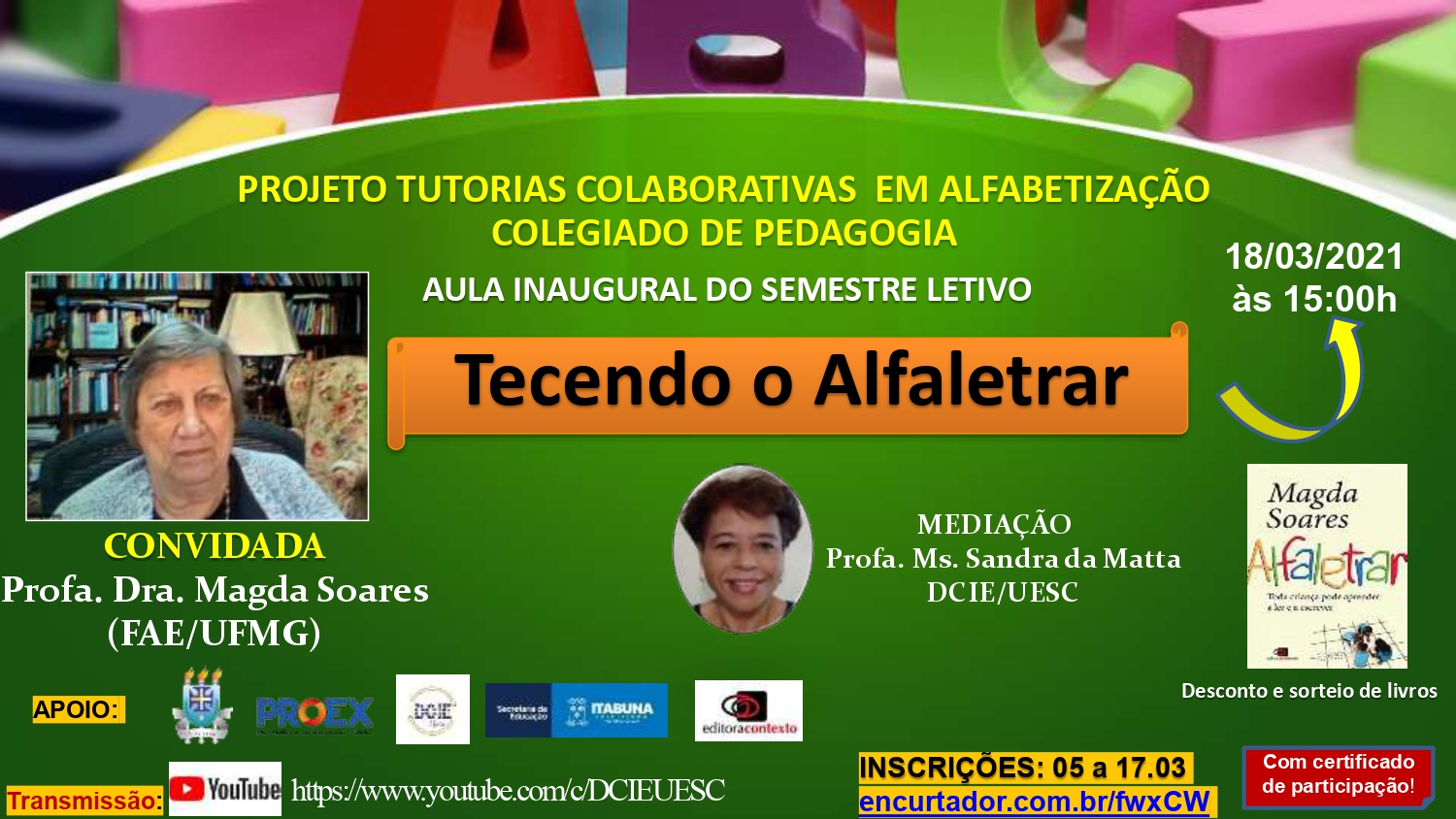 O Projeto de Extensão Tutorias Colaborativas em Alfabetização e o Colegiado de Pedagogia da Universidade Estadual de Santa Cruz (UESC-BA) promovem a live "Tecendo o Alfaletrar" com a professora Magda Soares no dia 18 de março, às 15h.