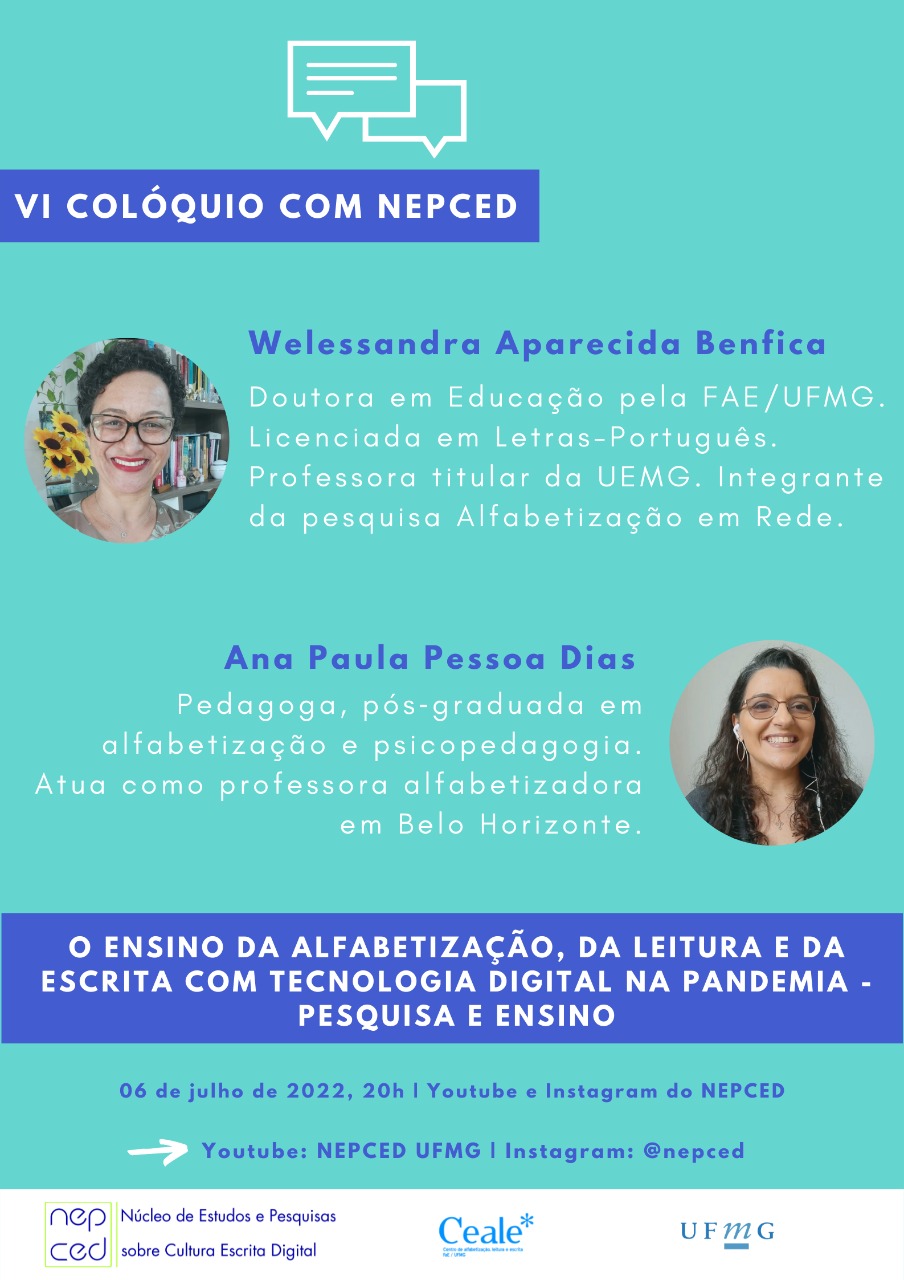 No próximo dia 6, às 20h, ocorre o VI Colóquio com NEPCED (Núcleo de Estudos e Pesquisa sobre Cultura Escrita Digital do Ceale/FaE/UFMG), que terá o tema "O ensino da alfabetização, da leitura e da escrita com tecnologia digital na pandemia - pesquisa e ensino". As convidadas são as professoras Welessandra Aparecida Benfica e Ana Paula Pessoa Dias. Haverá emissão de certificados.