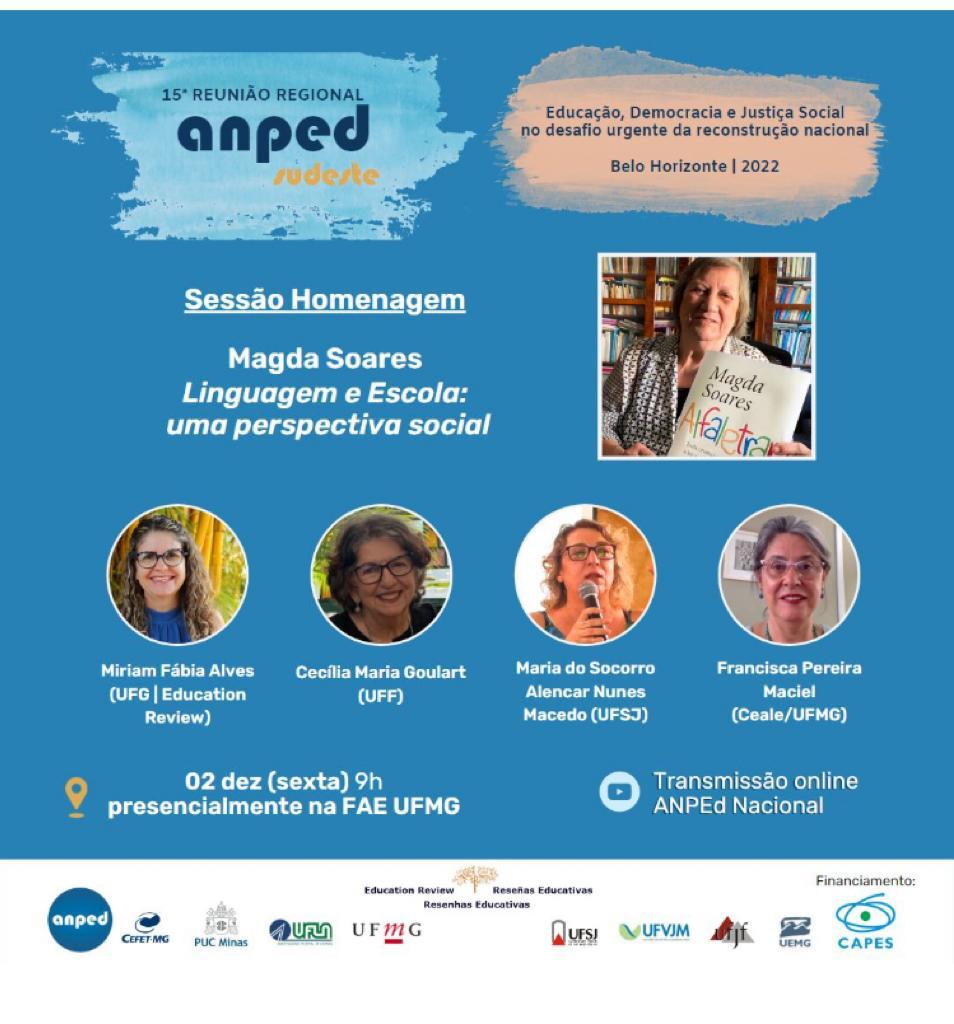 No dia 02 de dezembro, às 9h, acontece o último dia da "15º Reunião Regional ANPEd Sudeste", na Faculdade de Educação da UFMG, e tem como tema "Educação, Democracia e Justiça Social no desafio urgente da reconstrução nacional". O evento terá uma sessão de homenagem à professora Magda Soares, com a presença da professora da FaE e pesquisadora do Ceale, Francisca Maciel, além das professoras Cecília Goulart (UFF) e Maria do Socorro Nunes (UFSJ).