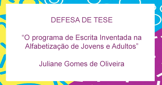 Amanhã ocorre, a partir das 9h, na sala 402 da Faculdade de Educação da UFMG, a defesa da tese "O Programa de Escrita Inventada na Educação de Jovens e Adultos". A autora da tese é Juliana Gomes de Oliveira e banca examinadora é composta pelas professoras Francisca Maciel (UFMG), Margarida Alves Martins (ISPA - Lisboa, Portugal), Paula Cristina Rodrigues (UFOP), Sara Mourão (UFMG), Valéria Resende (UFMG), Daniela Montuani (suplente / UFMG) e Márcia Monteiro (suplente / UEMG). A defesa é aberta ao público.