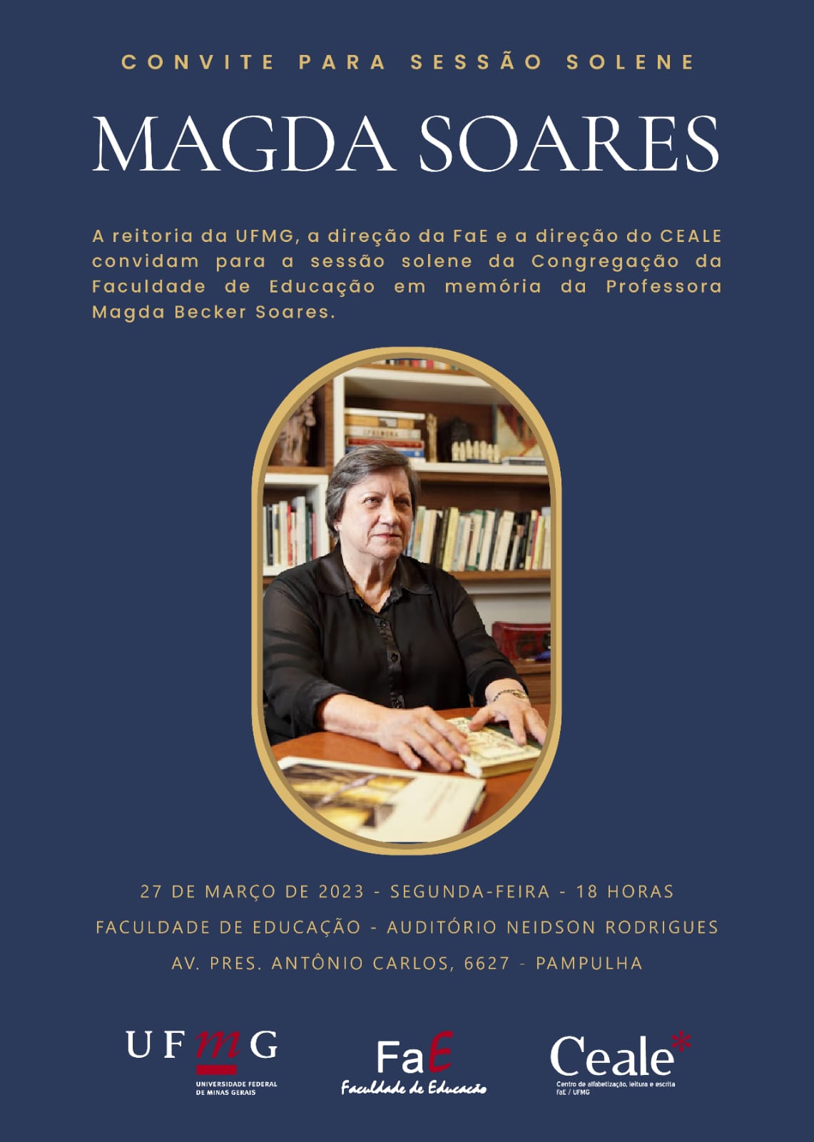 A reitoria da Universidade Federal de Minas Gerais, a direção da Faculdade de Educação e a direção do CEALE convidam para a sessão solene da Congregação da Faculdade de Educação em memória da professora Magda Becker Soares. A cerimônia acontece no dia 27 de março, no Auditório Neidson Rodrigues da FaE-UFMG e será aberta ao público.